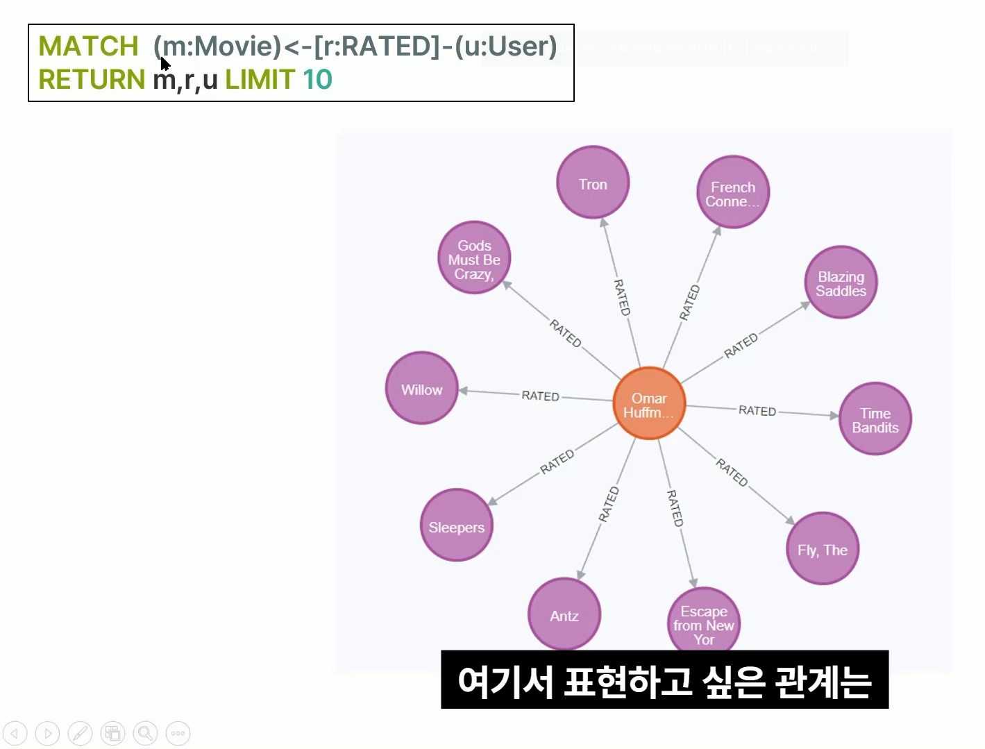 - RETURN : 위에서 표현된 노드와 릴레이션들 중 어떤 값을 반환할 건지에 대한 설명을 RETURN 구문에 작성