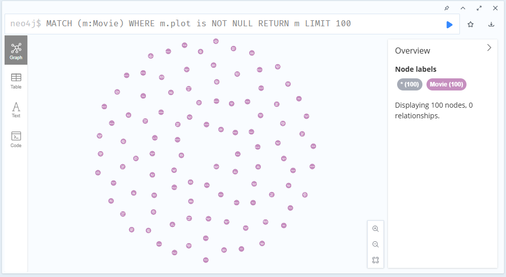 MATCH (m:Movie) WHERE m.plot is NOT NULL RETURN m LIMIT 100