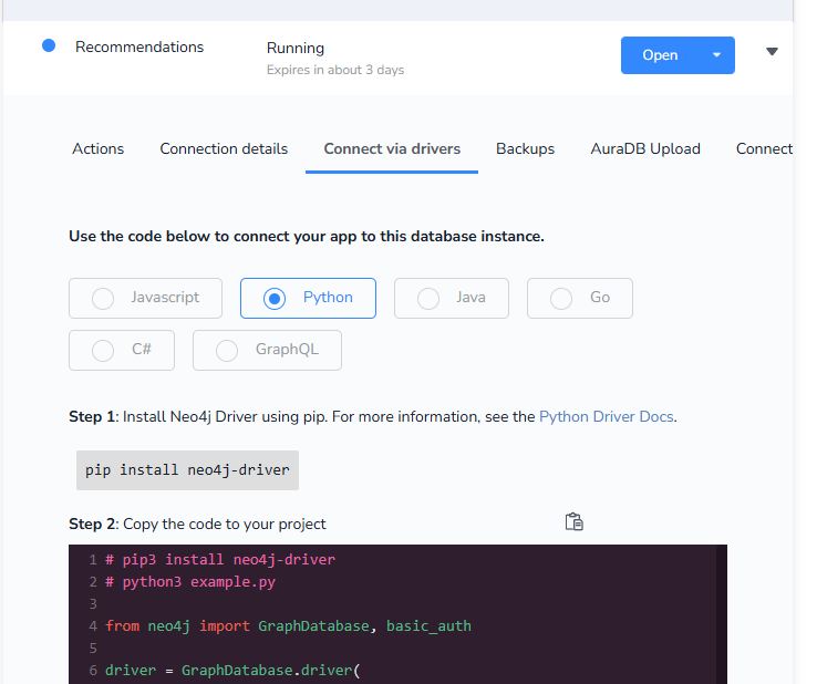 neo4j 드라이버로 코랩에서 연결해주어야 하기 때문에 아까 open 있었던 곳으로 가서 Connect via drivers로 auth 관련 드라이버 값들 사용하기