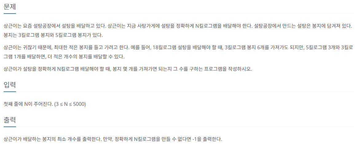 (+1을 해주는 이유는 만약 지금 5나 3으로 나누어지거나 구성할 수 있다면, 이전 dp[i - 5] 혹은 dp[i - 3]일 때보다 1개 많은 설탕 봉지를 갖고 있기 때문이다.)