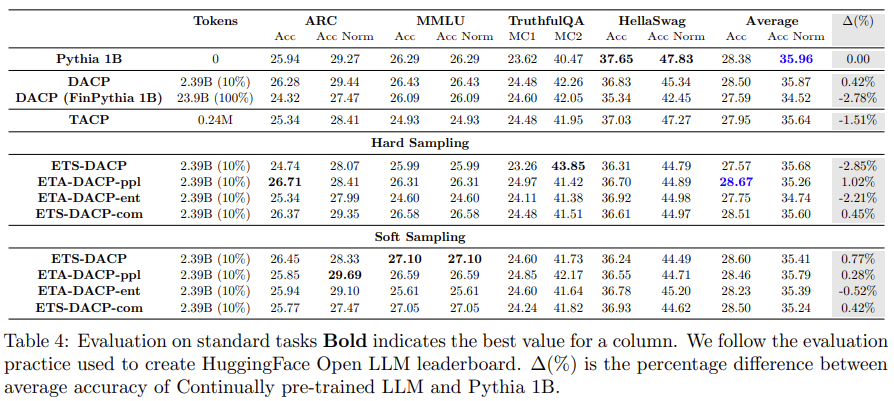 - Pythia-1B에 비해 TACP가 상당한 향상을 보이는 반면, ETS-DACP는 Average task 성능에서 DACP, TACP 및 제안한 efficient DACP 중 가장 높은 성능을 보임.